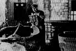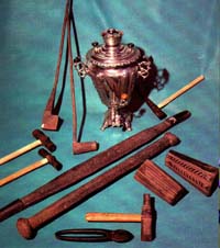 Немало творческой фантазии вкладывали мастера в отдельные детали, приобретавшие сказочные формы. Таковы, например, самовары из мельхиора, самовар с ручками в виде дракона, с виноградными лозами и другие. Несмотря на различие в оформлении и отделке, устройство всех самоваров одинаково. Каждый самовар состоял из следующих частей: стенки, кувшина, круга, шейки, поддона, ручек, репейка, стебла крана, ветки, донышка, решетки, душничка, подшишек, деревянных приделок, конфорки и заглушки. Непросто было овладеть ремеслом самоварщика. Вот что вспоминает старожил-самоварщик деревни Маслово Н. Г. Абросимов: "Работать учеником начал с 11 лет. Три с половиной года обучался этому ремеслу. Для стенки (корпуса) резали определенного размера латунь, затем ее свертывали в цилиндр, и эта форма наводилась в двенадцать приемов. Латунь с одной стороны надрезали зубцами и затем ударами молотка закрепляли по соединительному шву, после этого несли в кузницу. Потом мастер (наводильщик) повторял операции по заделке шва с помощью молотков и напильников и каждый раз закреплял отжигом в кузнице. Бегали в кузницу от мастера к мастеру и обратно мальчики-ученики и постепенно присматривались, как работает мастер. Немало пота пролито и бессонных ночей проведено, прежде чем по заказу фабриканта стенка сделана. А привезешь сдавать в Тулу фабриканту, иногда брак обнаружит. Труда много затрачено, а получать нечего. Работа тяжелая, но полюбил я ее, приятно было, когда из листа латуни сделаешь чудо-стенку". До недавнего времени Николай Григорьевич хранил набор инструментов, которые ныне передал в музей. ![]() Инвентарь самоварщика переходил от отца к сыну, а по мере изнашивания заменялся новым. Сумма для приобретения набора инструментов подвергалась большому колебанию в зависимости от избранной мастером специальности в производстве. Например, комплект рабочего-наводильщика стоил 60 рублей. В комплект входило несколько кобылин, стойна, напильники, ножницы, формы для разгранки фасона, гнедки и молотки. Главным материалом для изготовления самоваров служили: медь зеленая (латунь), красная (сплав меди -50- 63% и цинка -37-50%), томпак (сплав меди -85-90% и цинка -10-15%). Иногда самовары серебрили, золотили, а то и делали из серебра и мельхиора (сплав меди -50- 60%, цинка -19-39% и никеля -13-18%). Самоваров из томпака изготовлялось в 10 раз больше, чем красных (из сплава меди -50-63% и цинка -37-50%). Будучи дороже, красивее, роскошнее, они расходились по домам знати. В 1850 году томпаковый самовар стоил 25-30 рублей штука, в зависимости от отделки. Но основную массу самоваров изготовляли из зеленой меди.