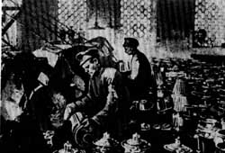 ![]() в Париже 1889 г. ![]() в Чикаго 1893 г. ![]() в Лондоне 1909 г. ![]() в Нижнем Новгороде 1896 г. На художественно-промышленных выставках за самовары наследники В. С. Баташева получили три награды: "Гран-при" в 1903-1904 годах в Петербурге на международной художественно-промышленной выставке, в 1904 году на международной выставке в Париже и в 1911 году в Турине, три почетных диплома и более 20 других наград. В фондах Тульского музея самоваров насчитывается большая коллекция разнообразных фасонов самоваров фабрики В. С. Баташева и его наследников. Среди них самовар красной меди 1870 года - флорентийская ваза, томпаковый овально-лощатый, уникальная коллекция сувенирных самоваров, которые были изготовлены в подарок царской семье в 1909 году. Самоварчики выполнены с большим искусством в форме ваз греческой, рококо, зеркальной, византийской рюмки и гладкого шара. Самовары эти емкостью 200 граммов, действующие, изготовлены в подарок детям царя Николая II: четырем дочерям и сыну. В течении столетий менялись фасоны самоваров. К концу XIX века их число доходило до 165. При такой разнотипности процесс производства полностью механизировать невозможно. Поэтому почти неизменными были орудия труда: кобылины в виде железных брусьев с утолщением на концах для ковки стенки самовара, весом до двух пудов каждая; стойла или вертикальная кобылина для ковки гладких самоваров, для закругления на самоварах; гнедки для разгранки самоваров; паяльники для спайки кувшина с корпусом самовара; ножницы для резки металла; наковальни; наборы молотков; штемпеля для клеймения самоваров; железные формы для формирования самоваров. По ведомости оборудования и рабочей силы самоварной фабрики братьев Баташевых за 1883 год можно судить о размахе их предприятия: молотков -500; горнов -20; мехов -20; кобылин -300; тисков -250; подпилков -400; паровая машина - одна; ножниц -100; клещей -50; токарных станков -42; резцов -40; мастеров -125; подмастерьев -100; учеников -30; поденщиков -45. За год на фабрике было изготовлено 6000 штук самоваров на сумму 42 000 рублей. Во второй половине XIX века Тула по производству самоваров занимает первое место в России. В 1890 году в губернии действовало 77 фабрик с 1362 рабочими. На каждой из них трудилось от 3 до 127 человек. Для большей рекламы крупные фабриканты выпускают прейскуранты, каталоги, плакаты. В одном из плакатов Н. И. Баташева мы читаем: "Из всех существующих фирм Баташевых фирма "Наследник Н. Г. Баташева - Н. И. Баташев" является первой и старейшей в России и существует с 1825 г. Благодаря высокому качеству вырабатываемых фабрикой самоваров наша фирма издавна пользовалась наилучшей репутацией и тем самым добилась того, что самовары с клеймом "Баташев" стали требоваться не только в России, но и за границей. Видя такой успех самоваров нашей фирмы, в Туле появились как крупные, так и мелкие кустари, которые, пользуясь сходством фамилии с нашей фирмой, начали подделывать и подражать нашим клеймам и тем самым вводить покупателей в заблуждение. Не имея возможности бороться с этим злом и желая оградить нашу фирму от возможных подражателей и подделок наших конкурентов, мы заявили Министерству торговли и промышленности помещенную на сем этикете фабричную марку с обозначением на оной "1825 год". Только наша фирма существует с 1825 года, и никто из конкурентов не может подражать и подделывать это клеймо. За высокое ка